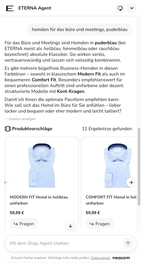 Neocom’s Shop Agent is a digital sales advisor embedded directly into your shop that replicates the experience of your best in-store expert. It understands customer intent, guides decisions in real time, and delivers a truly hyper-personal 1-to-1 experience across the entire shopping journey.